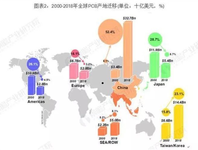 中國作為全球PCB行業(yè)的最大生產(chǎn)國,占全球PCB行業(yè)總產(chǎn)值的比例已由2000年的8.1%上升至2018年的52.4%,美洲、歐洲和日本的產(chǎn)值占比大幅下滑,中國大陸和亞洲其他地區(qū)(主要是韓國、中國臺(tái)灣和東南亞)等地PCB行業(yè)發(fā)展較快。